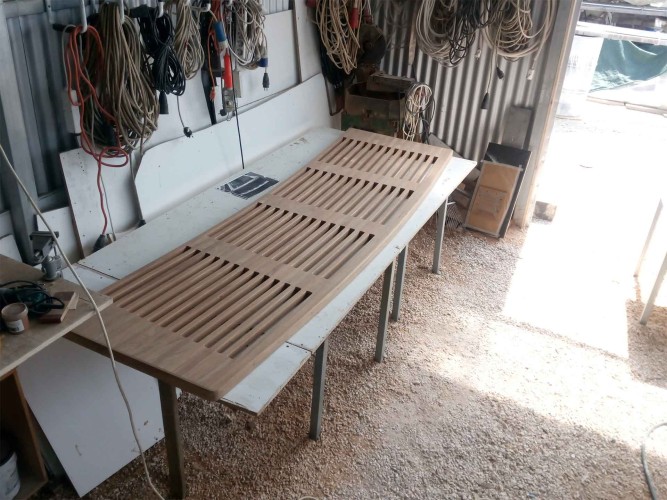 Εξειδικευμένες εργασίες καταστρωμάτων από ξύλο teak. Μας στέλνετε τα μέτρα ή το πατρόν του καταστρώματος σας και εμείς αναλαμβάνουμε να σας το στείλουμε έτοιμο. Εσείς απλά το τοποθετείτε ή ακόμα ερχόμαστε εμείς στο χώρο σας για την τοποθέτηση.Δείτε στην συνέχεια φωτογραφίες από μερικές κατασκευές.